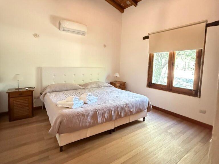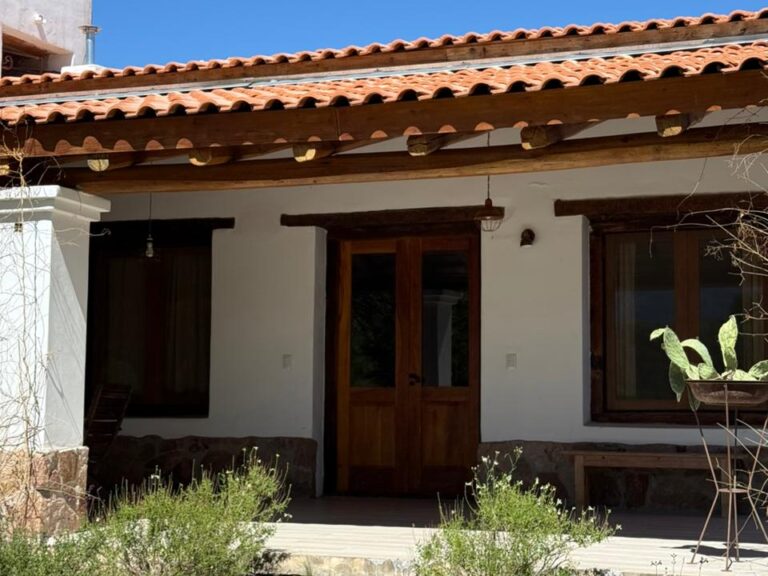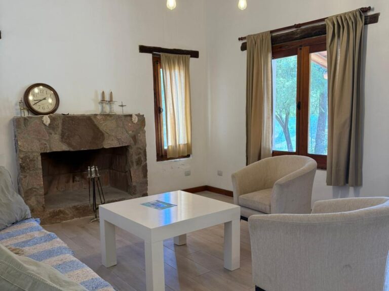 Casa de planta baja, 2 dormitorios y 2 baños. Galería con excelente vista al cerro Champaquí, asador con parrilla y mesa exterior con 4 sillas. Living comedor con mesa amplia para 4 personas, hogar a leña, aire acondicionado y sofá cama doble. Smart TV / Wi-Fi en todos los ambientes.