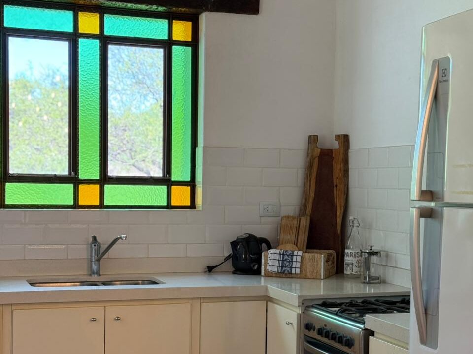 Cocina equipada con heladera con frezzer, cocina con horno eléctrico y hornallas, calefón eléctrico de agua caliente y termo solar, microondas, lavarropas automático, tostadora, jarra eléctrica y toda la vajilla completa para 6 personas. Dormitorio principal con cama matrimonial y acondicionador de aire. Dormitorio secundario con 2 camas individuales y acondicionador de aire.